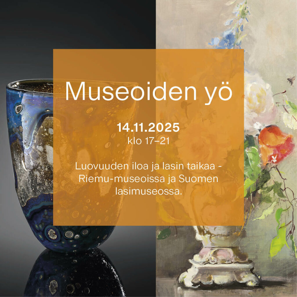 Riemu-museot ja Suomen lasimuseo tuovat syksyn pimeyteen valoa ja väriä, kun Museoiden yö kutsuu yleisön Riihimäelle kokemaan taiteen, lasin ja aistien juhlaa perjantaina 14.11.2025 klo 17–21. Tapahtumaan on vapaa pääsy.
