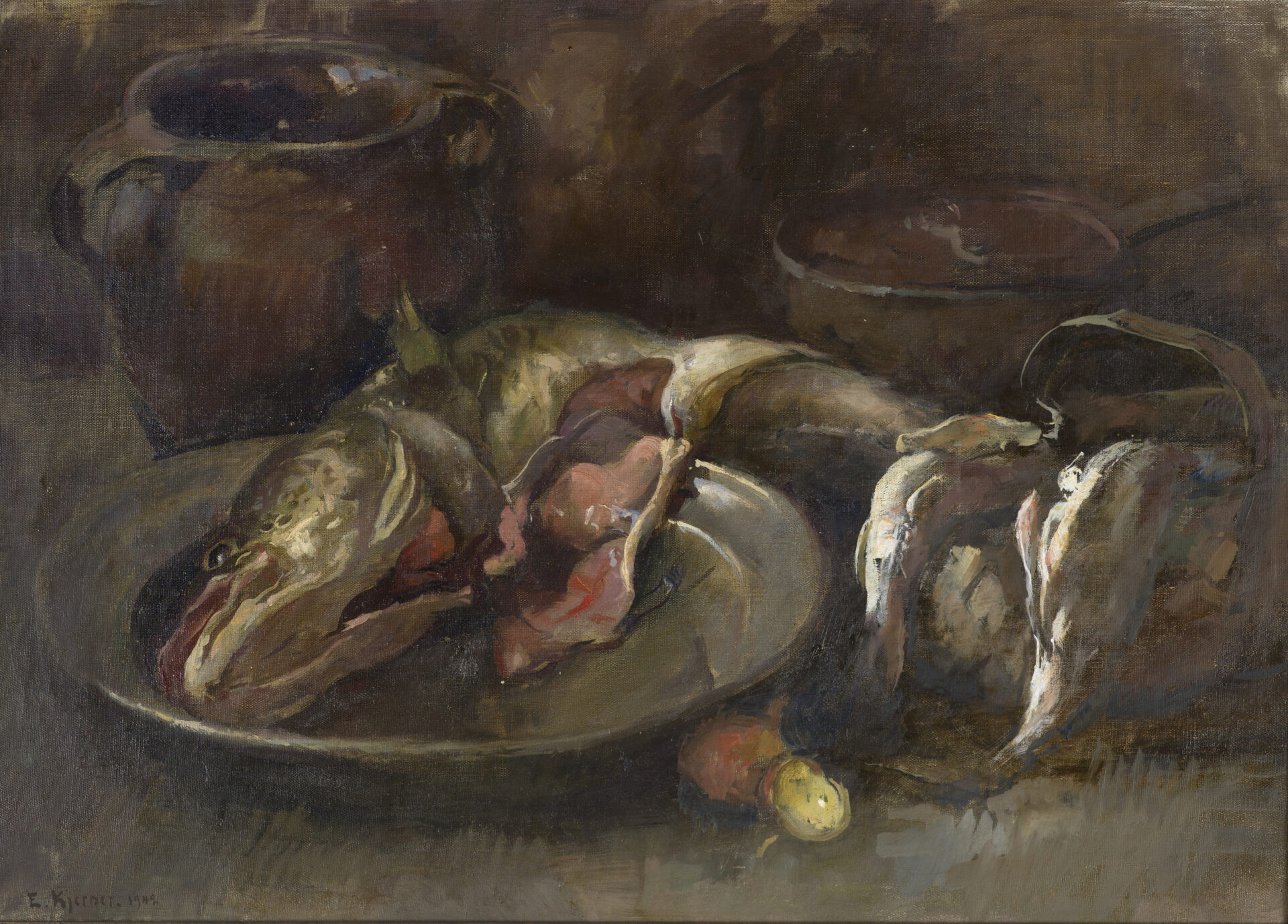 Taide on silmänruokaa, ja oikeanlainen ravinto hyväksi (silmien) terveydelle. Taiteilijalle molemmat olivat tärkeitä, elinehtoja: tehdä taidetta ja syödä. Niukat ja vaatimattomista ruoka-aineista koostuvat asetelmat, kuten Tyko Sallisen Silakka-asetelma, kertovat taiteilijoiden taloudellisesti tiukoista taiteilijavuosista. Jalmari Ruokokoski maalasi torilta ostettuja kaloja, jotka ensin toimivat malleina maalauksille, ja sen jälkeen ne valmistettiin ateriaksi perheen yhteiseen ruokapöytään. Marcus Collinin rapu-asetelma kertoo enemmän yltäkylläisyydestä – tai sitten se viittaa rapujuhliin. Hedelmiä ja kasviksia kuvattiin myös asetelmiin, joissa päämääränä oli kaunis, silmää ja mieltä miellyttävä ja myyvä lopputulos. Tällaisten teosten ajateltiin sopivan esille koteihin, ne sisälsivät jotakin tuttua ja helposti lähestyttävää. Roikkuvat riistalinnut, sienet ja perkausta odottavat kalat kertovat arkipäivän aterioista ja elämästä sen kaikkine sävyineen.